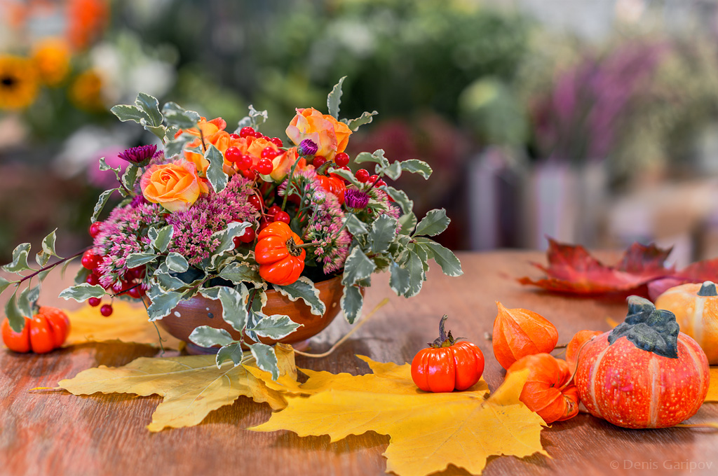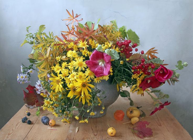 nahaufnahme einer herbst komposition mit einem gelben kürbis, eine eichel, rote herbst blume und einen kegel — осенние цветы стоковые фото и изображенияNahaufnahme ,…