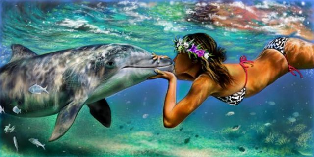 - На раскраске изображена молодая девушка, которая в изумлении смотрит на пару счастливых дельфинов.