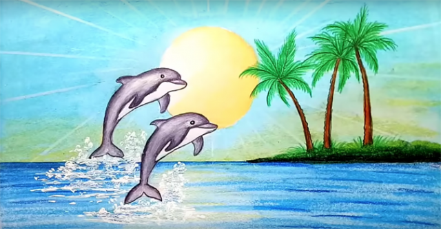 - Попросите вашего ребенка раскрасить дельфинов в контрастные цвета.Не забудьте раскрасить волны и небо.