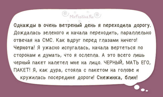 - Еду в маршрутке. Слышу, как девушка рядом разговаривает по телефону: «У меня сегодня важный день… Удачи желают неудачникам, а мне желают успеха». Остановка. Эта девушка выходит из маршрутки, цепляется наушниками за поручень, бьется головой и спотыкается о бордюр. @Helen1