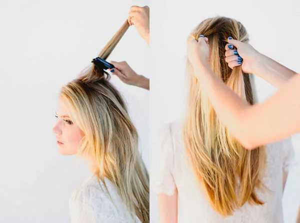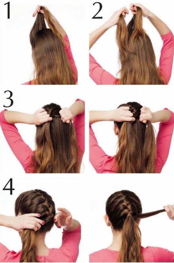 Эта прическа не сложна сама по себе, но плести ее легче на послушных волосах, потому не стоит пренебрегать средствами по уходу. От расчесанных полос отделить передние пряди и собрать в высокий хвост, после первых тренировок станет легко удерживать их рукой и резиночка уже не понадобится. Начинаем плести передние пряди как обычную косу.
