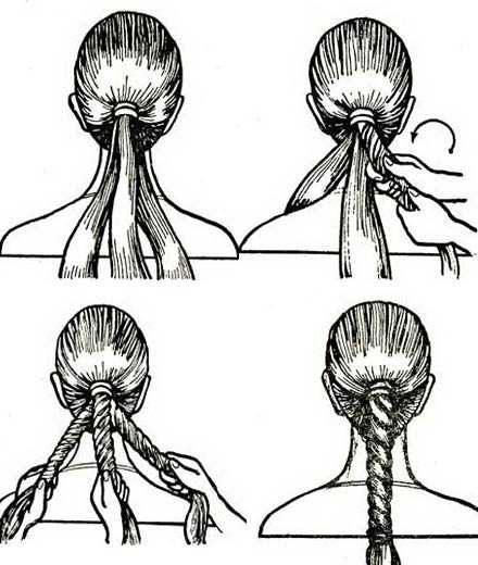 - Продолжают по аналогичной схеме: первый локон кладется на второй, третий локон кладется на четвертый. Затем первый локон помещают на третий, а третий на второй.