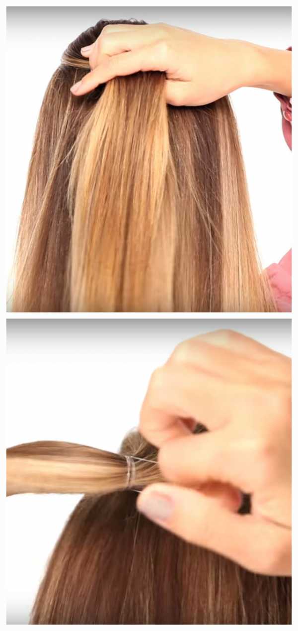 - Собираем небольшую часть волос ото лба в хвостик и фиксируем для удобства маленькой резинкой;