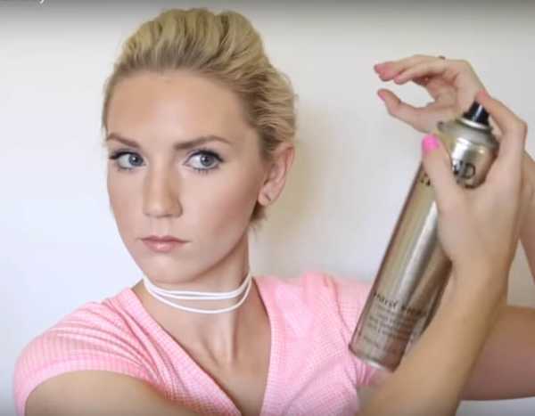- Волосы расчесывают и брызгают на них спрей для придания блеска. Возле лба отделите толстую прядку.