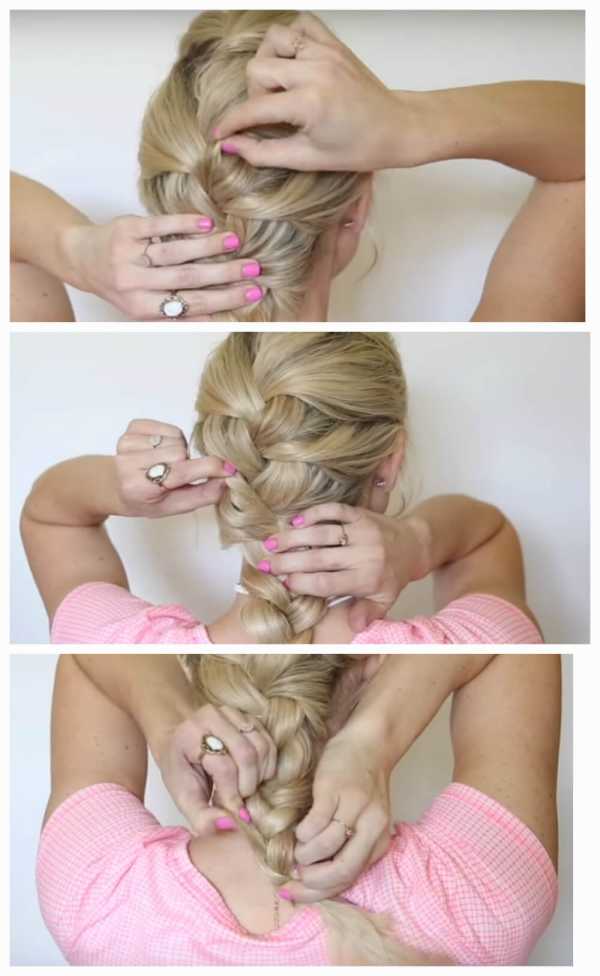 - Продолжаем плетение до основания шеи. Следующий шаг: заканчиваем процесс плетением обычной косы. Вот только боковые пряди надо пропускать не над, а под центральной.