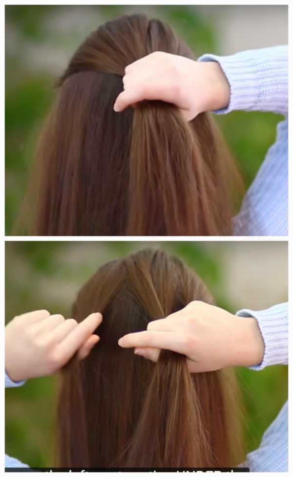 - Под центральную часть кладем правую часть и добавляем к ней небольшую часть волос справа.