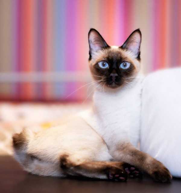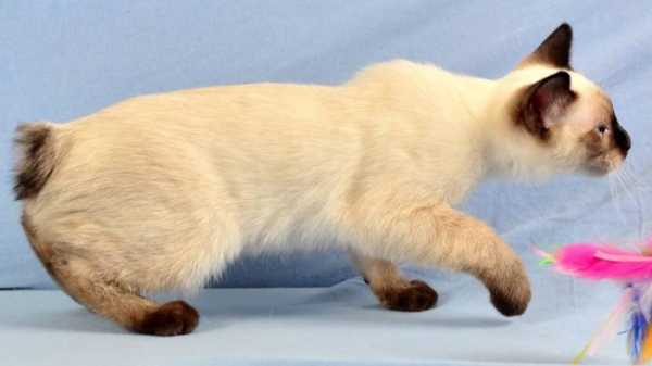 Этот кот, с обрубленным хвостом, имеет еще два названия: тайский или королевский бобтейл. Расцветка меконгского вида одинаковая с сиамскими кошками. Глаза синего цвета с косым разрезом, это отчетливо видно на фото. Шерсть гладкая и блестящая, подшерсток почти что отсутствует. Хвост короткий, изогнут может быть по-разному, к этому нет особых требований. А вот самый первый изгиб должен быть строго у основания хвоста – это отличительный признак породы.