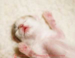 Развитие новорожденного котенка:Новорожденные котята фотоНоворожденный котенок рождается весом 80-120 гр., размеры котят при рождении — длина тела около 9-12 см. Новорожденные котята в этот период абсолютно беспомощны, они слепы, глухи, не умеют регулировать температурный режим. У новорожденных котят нет подшерстка, шерсть тонкая, слабая и совсем не греет.Новорожденный британский котенок фотоКотята не умеют стоять на лампках, их кости очень хрупки, поэтому малыши требуют особого бережного отношения к себе. В это время сон и котята понятия почти не разделимые. Новорожденные котята практически постоянно спят, много и часто кушают. Сон котятам необходим для дальнейшего формирования нервной системы. Испражняться самостоятельно новорожденные котята также не умеют, мама-кошка вылизывает их гениталии и съедает их испражнения. Вот что действительно отлично развито у новорожденных котят, так это обоняние и осязание, они без проблем находят соски матери, перебирая лапками, сосут и, тем самым, стимулируют дальнейшую выработку молока.Новорожденные шотландские котята скоттиш страйт В этот период котят лучше вообще не трогать, только следить за весом. Котята должны прибавлять его ежедневно (около 10-20 гр. в день), если котенок растет, значит все в порядке.