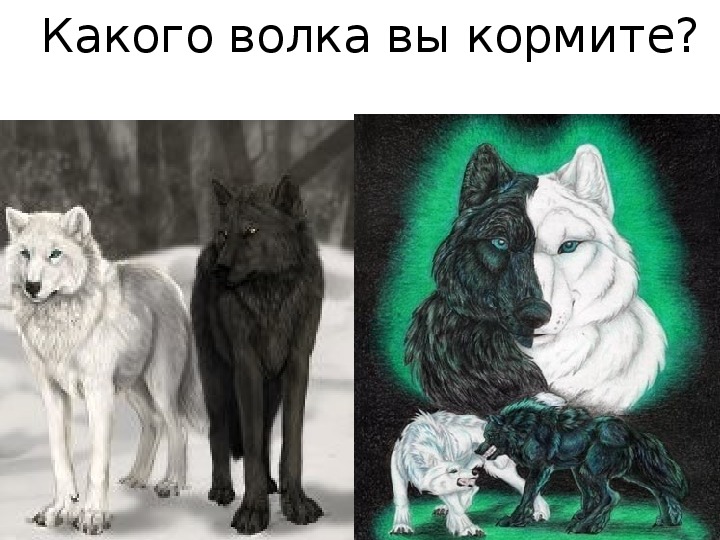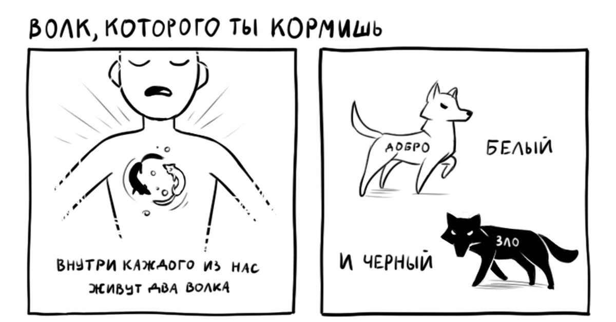 и история продолжается:«Видите ли, если я решу кормить только Светлого волка, Темный волк будет прятаться за каждым углом, ожидая, пока я отвлекусь или ослабею и прыгну, чтобы привлечь внимание, которого он жаждет. Он всегда будет злиться и всегда будет сражаться со Светлым волком».