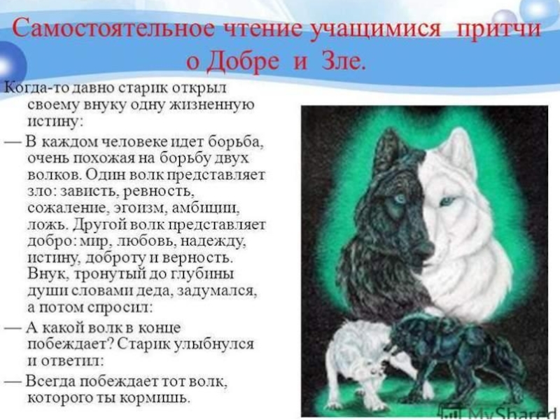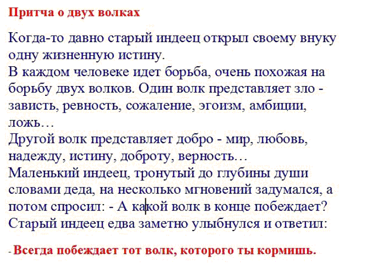 Такая же борьба происходит и в тебе, и в каждом человеке человеке. Внук задумался на минуту, а потом спросил деда: «Кто из волков победит?»