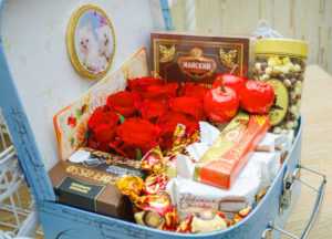 - Вместо цветов можно преподнести невесте корзину со сладким наполнителем: конфетами, помадками в виде сердечек и леденцами.