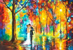 Особенный восторг вызовет подарок, тема которого будет связана с молодоженами, например, на картине будет изображено кафе, где они познакомились, или у вас получится похожий портрет пары.
