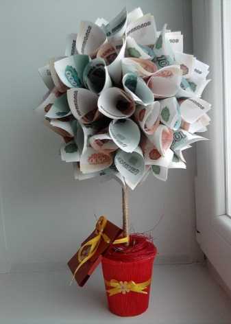 - деньги – но не в конвертике, а поданные в виде торта, коробки конфет или топиария.