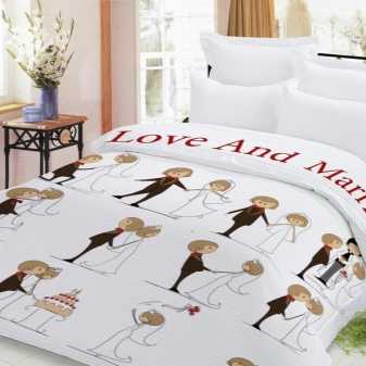 В подарочную корзину можно положить вместе с фруктами и сладостями инструкцию семейной жизни и сертификаты мужа и жены с должностными обязанностями, а также мешочек соли и сахара с пожеланиями быть вместе и в радости, и в горе. На постельное бельё можно заказать семейные монограммы или фотопортрет молодых. Оригинальные идеи не исчерпываются семейной тематикой. Также можно использовать любые другие мотивы, например, пайетки, блестки и звездные стразы по всей поверхности пододеяльника.