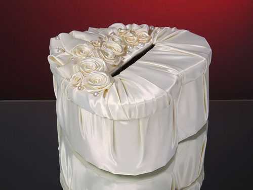Если это предмет небольших размеров, можно использовать дорогую ткань типа парчи, атласа и органзы. Комбинация этих фактур как нельзя лучше подчёркивает торжественность обстановки. Также можно снабдить его свадебными атрибутами: фатой и черным бантом. Особенно выгодно это будет смотреться на парных подарках. Большие и средние подарки упаковывают в подарочную бумагу с использованием в качестве декора сердечек, лент, цветов и мишуры.
