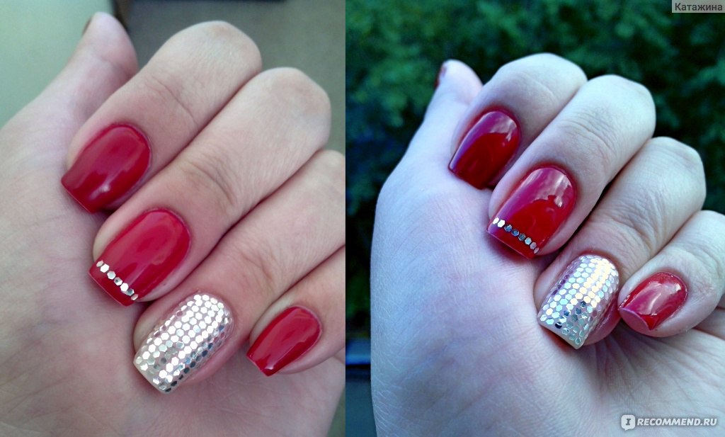 Для дизайна можно использовать как яркие оттенки красного: алый, ягодный, роза, малиновый, так и темные тона: винный, мерло, гранатовый, джем и другие. Обратите внимание на цвет блесток в гель-лаке. Для повседневных образов лучше использовать серебряный материал, для торжественных – золотой или радужный.