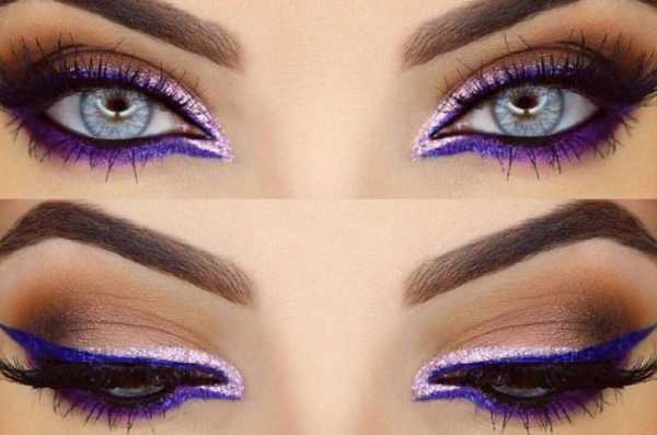 На слизистую нижнего века наносятся ярко-голубые тени, а на верхнем рисуется стрелка при помощи фиолетовой туши.