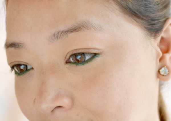 Теперь наносим тени на нижнее веко – от внутреннего уголка и примерно на 2/3 всей длины наносятся тени медного цвета, а дальше, вплоть до внешнего уголка глаза – зеленые тени. Их также не нужно растушевывать.