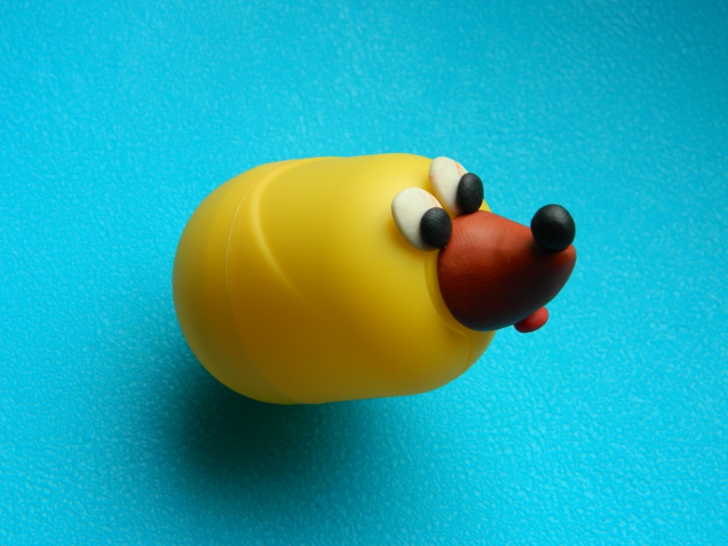 Шаг 7. Стекой с шариком на конце продавливаем две ямочки для глазок. В серединке ямок фиксируем черные шарики-глазки. Также присоединяем к кончику мордочки мини-носик.