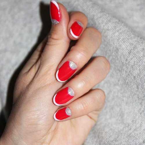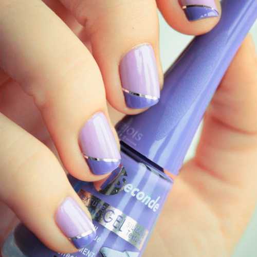 Элегантно и необычно смотрится вариант с двойной улыбкой. Например, белый край можно отделить от ногтевой пластины с помощью тоненькой серебристой линии, а можно покрыть ноготь прозрачным лаком, нарисовать улыбку сливочного или нежно-розового цвета и шириной около 2 мм по линии, где начинается свободный край ногтя, а кончик ногтя покрыть белым.