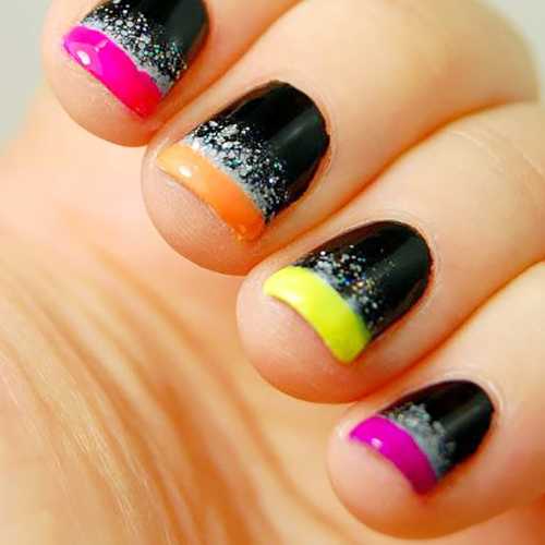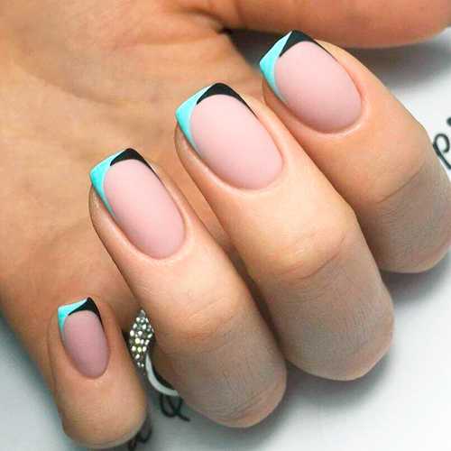 Беспроигрышно выглядит многоцветный французский маникюр. Например, сочетание синего, черного и белого.