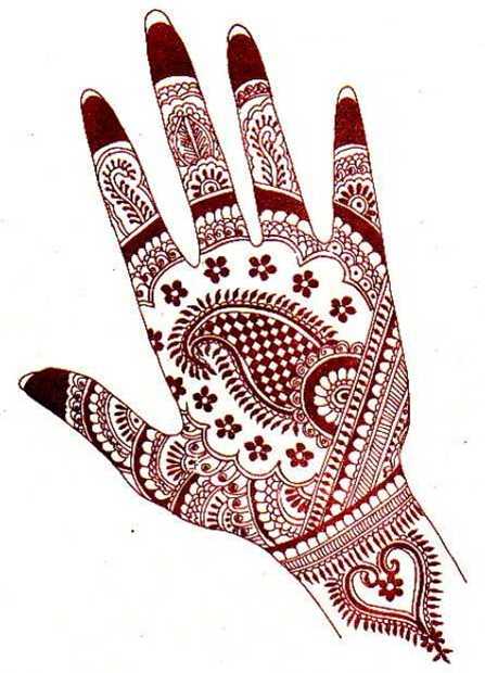 Мехенди Индии и Пакистана достаточно сложна в исполнении, потому как рисунок не ограничивается какой-то одной частью тела, зачастую росписи подвергается весь кожный покров от шеи до пяток. Если не всматриваться, то может показаться, что руки в перчатках. Эта иллюзия создается благодаря самому рисунку: кружевному, с плавными линиями и каплевидными орнаментами. В качестве изображений служат религиозные мотивы.