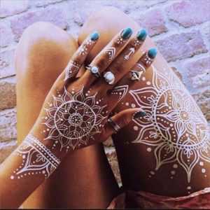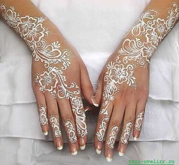 Североафриканская роспись более геометрична, имеет строгие линии. Жители Северной Африки часто даже не заморачиваются по поводу рисунка, а предпочитают окунуть ладони и ступни в хну. Она оказывает антисептическое действие, что в жару приходится очень кстати. В арабском стиле используется тематика флористики. Много изящных цветов всегда выглядят великолепно на теле женщины. В азиатском — смешивается арабский и индийский стиль. Фаланги пальцев или боковую часть ступни покрывают сплошным слоем хны. Индийский мехенди состоит из цветов, кругов, спиралей, образов животных, птиц и др. Такие узоры мехенди просто невероятны! Но это не просто эстетически привлекательное украшение. Рисунки мехенди имеют особое значение. Следует внимательно относиться к нанесенным на тело символам. Например, изображение слона хной, символизирует удачу и процветание. Как видите, даже к био-тату можно относиться, как к талисману. Существует много разной хны для мехенди. Ее можно купить в различных женских магазинах по уходу за телом или поискать в просторах интернета, где подобного добра еще больше. Самое любимое украшение тела для многих современных девушек — мехенди белой хной. Отлично смотрится на загорелой коже, невероятно нежный рисунок.