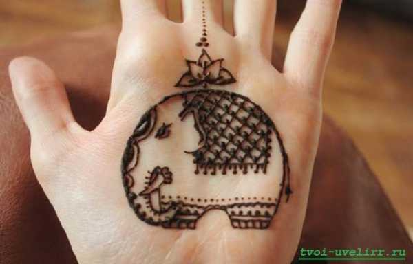Распространено в мехенди и изображение слона. Это животное связывают с символикой власти, почета, интеллекта, благородства, могущества, долгой жизни и всеобъемлющей доброты. Слоны отлично подойдут в качестве тату для мужчин как знак храбрости и доблести. У женщин данный рисунок символизирует мудрость и безмятежность.