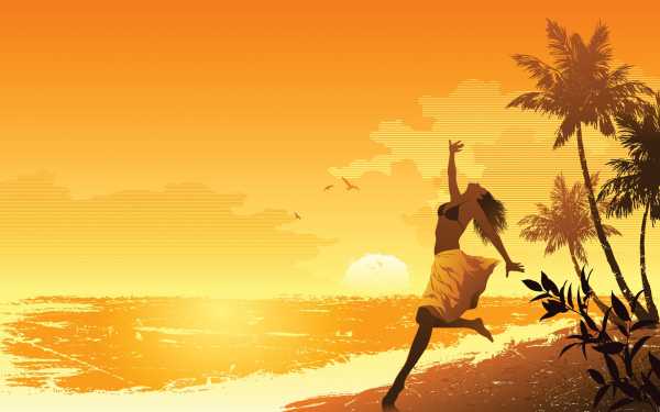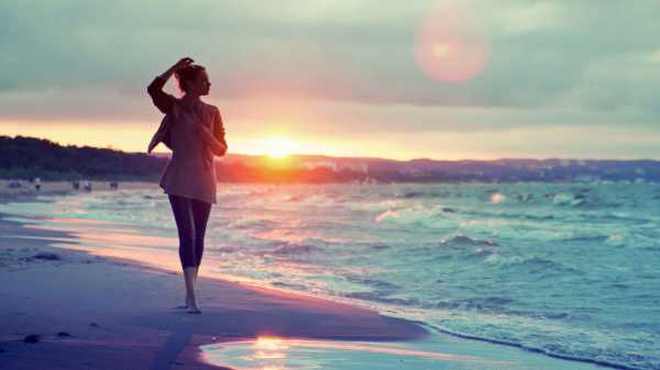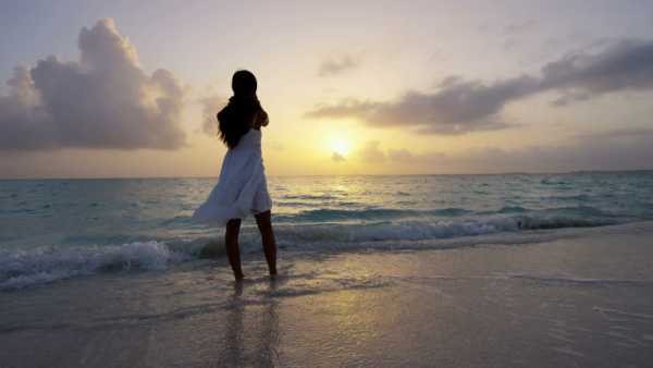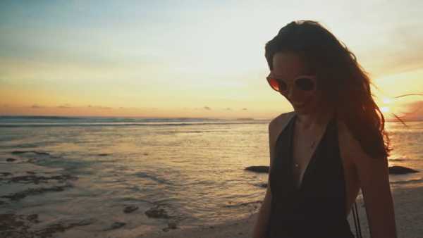 Девушка идет по берегу моря на закате