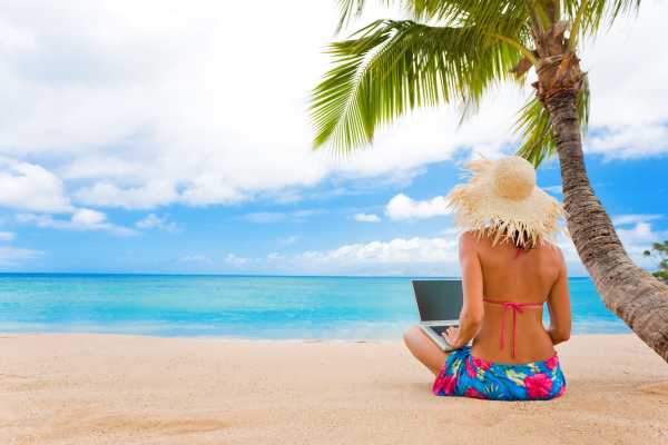 Девушка сидит у моря с ноутбуком