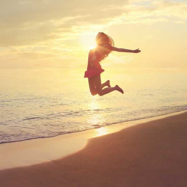 Девушка, подпрыгивает на берегу моря