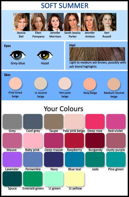 Таким образом, ваша цветовая палитра включает низкую насыщенность, низкий/средний контраст, холодные цвета. Мягкий серый и голубой, темно-розовый и лавандовый и даже светло-синий . Синий занимает центральное место в палитре, но из-за эффекта Осени также появляются зеленые и бирюзовый . Желтые часто имеют зеленоватый и грязно-пастельный цвет, немного похожий на слабый луч света, проходящий сквозь туман. Палитра Soft Summer включает множество оттенков серого и оливкового . Цвета не четкие, а сложные и неуловимые, как будто состояли из множества разных оттенков.Мягкое лето Комбинации цветов