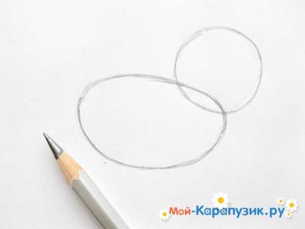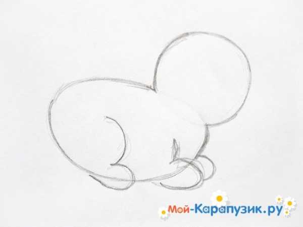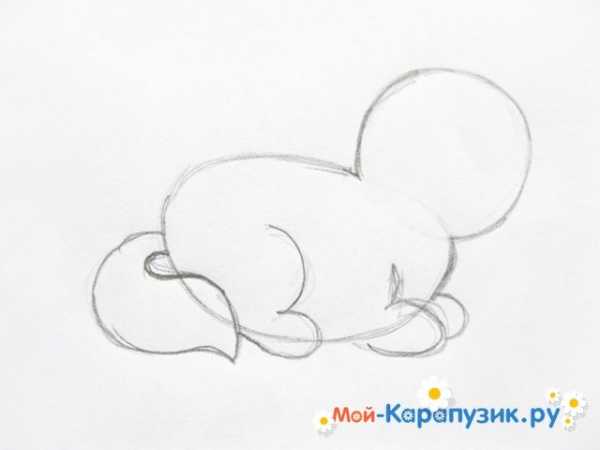 2. Прорисовываем внизу лапки. Пару передних будут находиться с правой стороны. Они будут хорошо видны. Задних же будет видно только одну. Ее нарисуем ближе к концу овала. Убираем ластиком линии между кругом и овалом.