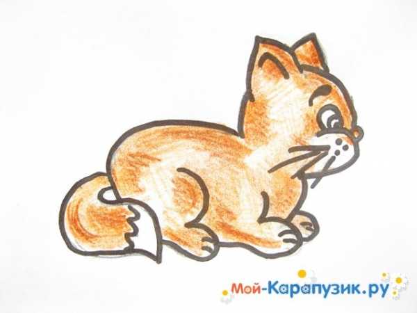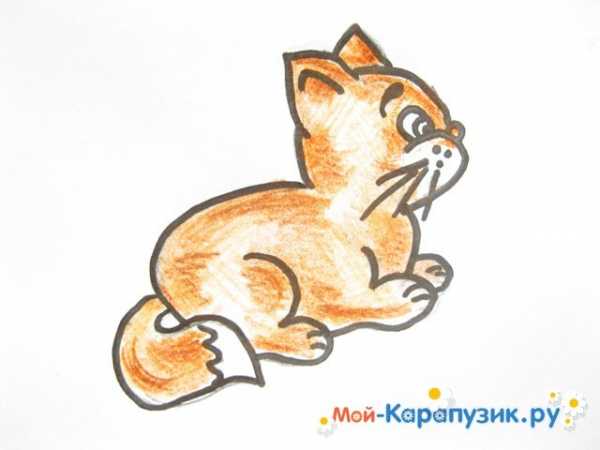 8. Разрисовываем котенка оранжевым маркером. Так наше милое домашнее животное будет иметь рыжий оттенок. Только не следует его наносить на щечки возле носика и кончик хвоста. Эти места должны остаться белыми.