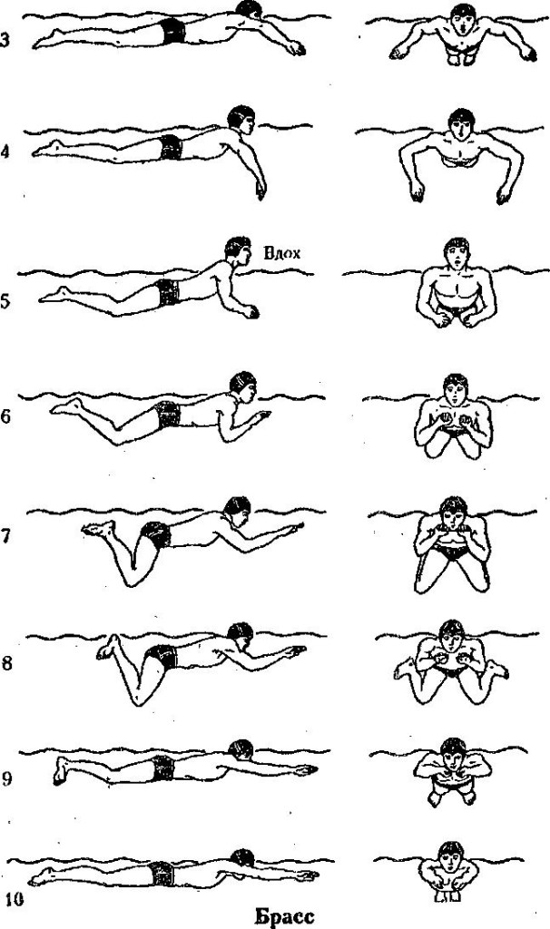7-е упражнение: то же самое, что и 6-е упражнение, только добавляем работу рук. Есть два варианта: гребите под водой по собачьи, или брассом. И в том, и в другом случае следите за главным – руки должны двигаться на уровне Вашего лица под водой, но не под животом. Тогда Вам значительно легче будет выполнять вдохи в следующем упражнении.