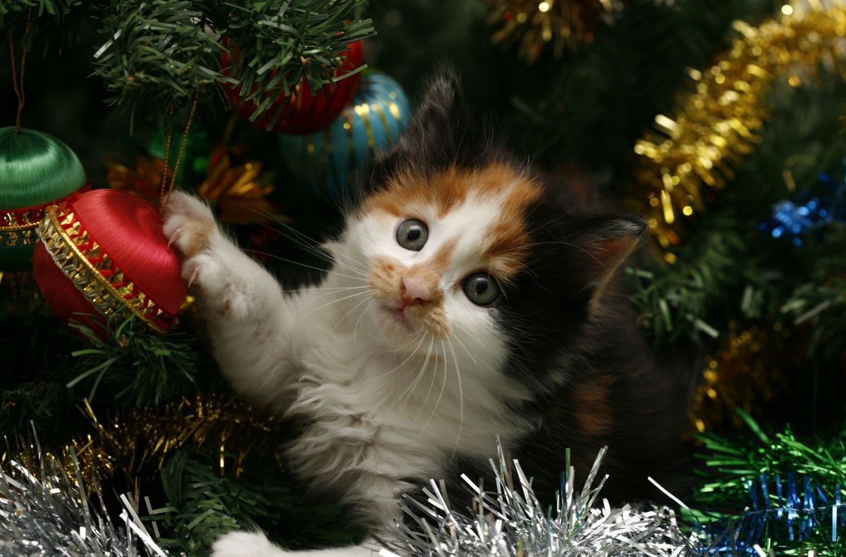На данной прикольной новогодней открытке забавный кот в новогоднем колпаке с красным бантом. Нежный бело-голубой фон, красивая рамка и стильный шрифт.