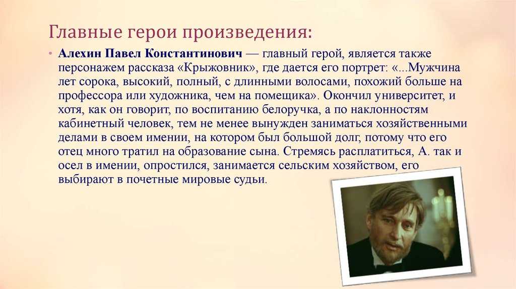- — владелец большого, но небогатого поместья, холостяк, интеллигентный и образованный, мягкий и нерешительный.