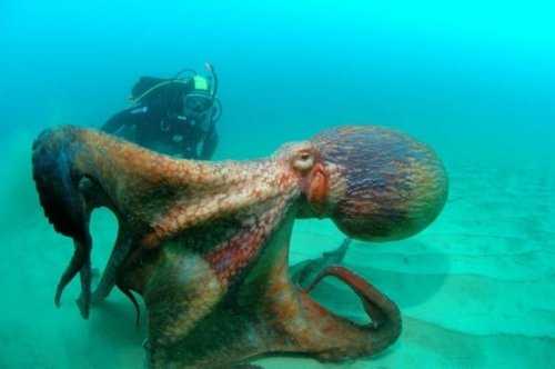 19. Вот это осьминог. Только посмотрите на его размеры, аж страшно становится. Удивительно в осьминоги то что у него находится целых три сердца! Это удивительно, так же у осьминога есть печень поджелудочная железа, пищевод проходит через мозг. У осьминога самый большой мозг, и еще, у него голубая кровь, так же как у скорпионов, пауков и раков.