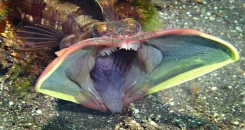Морские хищники вида Neoclinus blanchardi встречаются на глубинах от 3 до 70 метров в тихоокеанских водах у берегов Северной Америки. Главное оружие этих жутковатых рыбок – их широко раскрывающийся рот, который они растягивают, когда чувствуют угрозу. Такой механизм защиты визуально увеличивает щучью морскую собачку до размеров более крупной особи и отпугивает некоторых неприятелей. Хотя и демонстрация зубов обычно действует весьма убедительно. Самцы Neoclinus blanchardi предпочитают выяснять отношения именно с помощью своих огромных ртов, и победителем из схватки выходит тот, чьи губы раскрылись шире. Чаще всего эти существа встречаются в районе Калифорнии, и они очень ревниво относятся к нарушению своей территории, что иногда приводит к стычкам даже с аквалангистами. Если встречи не миновать, рыбешка готова на самый последний «поцелуй» в своей жизни, и поверьте, лучше избегать таких встреч.