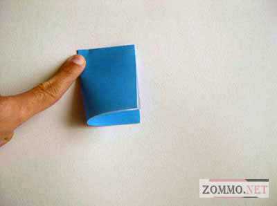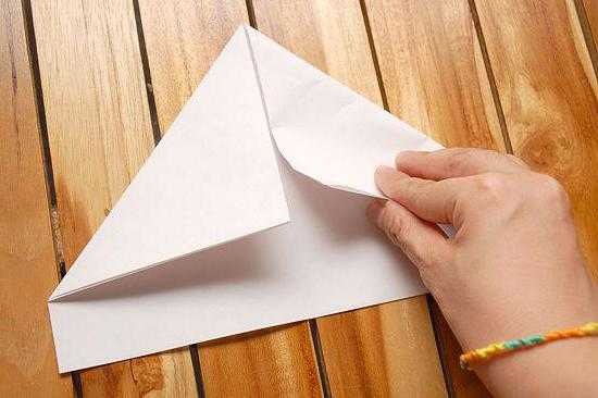 - Отступите от основания получившегося равнобедренного треугольника примерно треть его высоты и загните смотрящий вверх угол вниз.