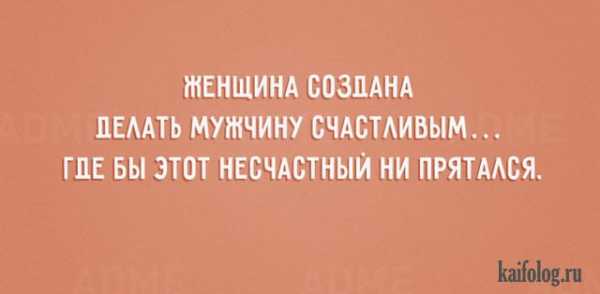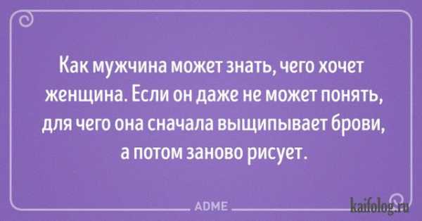 Мудрые и остроумные открытки про отношения полов. Сказать честно, не такие уж они умные, сколько блондинистые даже, но почему-то остроумные и всё тут. Видимо, потому, что понятны всем и каждому. Именно такую тематику я выбрала для сегодняшней подборки прикольных открыток. обязательно посмотрите подборку: в ней присутствуют правдивые мысли про мужчин, женщин, тонкости отношений, психологию полов и т.д. Т.е. очень интересно вне зависимости от того, есть ли у вас на вторая половинка или нет. А всем счастливым обладателям жён и мужей эти открытки уж точно должны понравится. Жду комментарии.