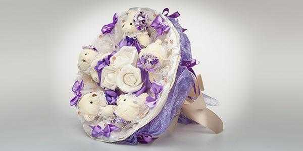 - Букет из милых мягких игрушек, перевязанный алой лентой и дополненный открыткой-сердечком.