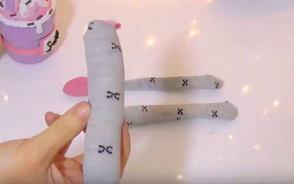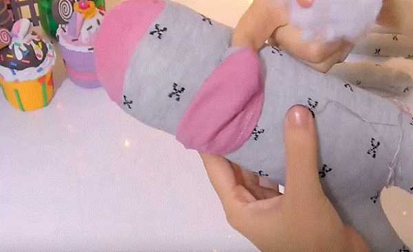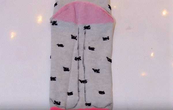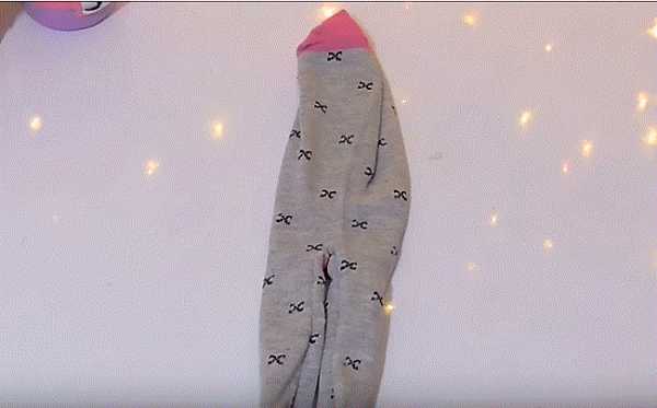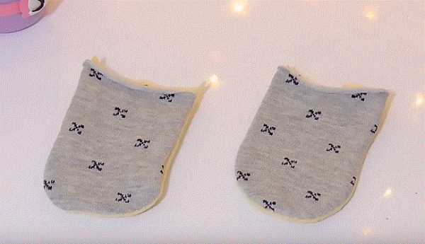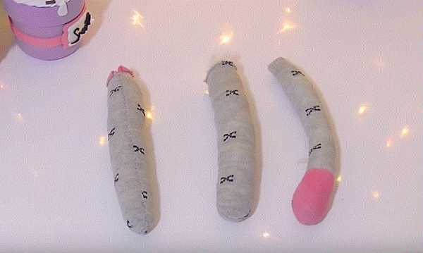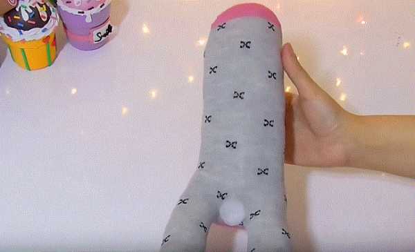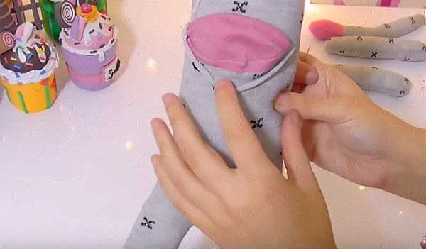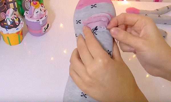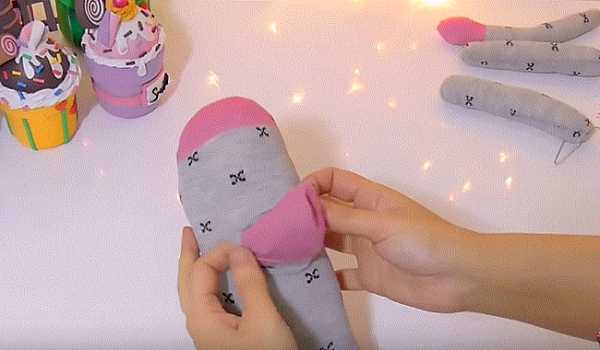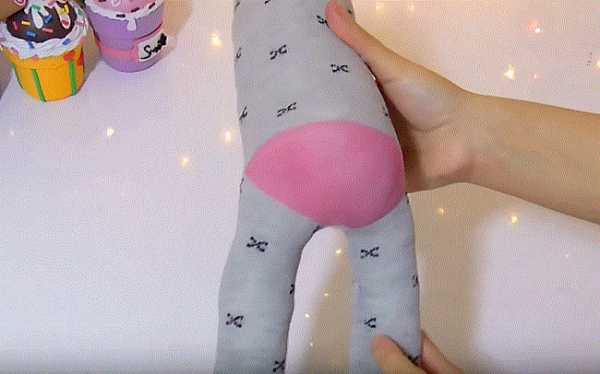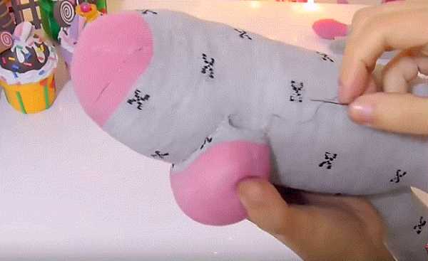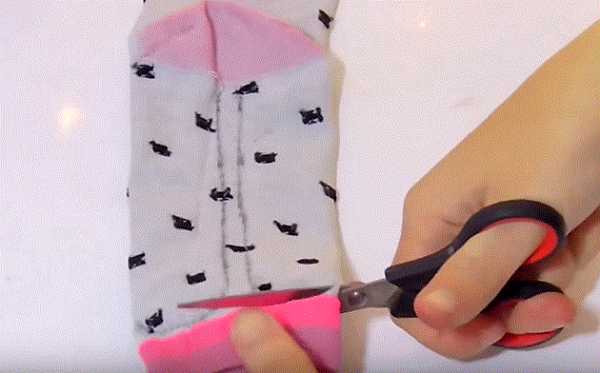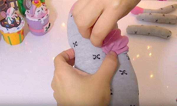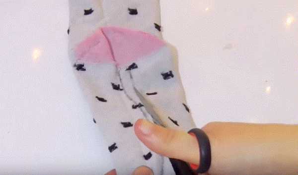 16. Ножницами разрезаем и делим с припуском носок на части: 2 лапки и хвостик. Отрезаем розовую резинку носка.
