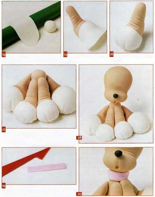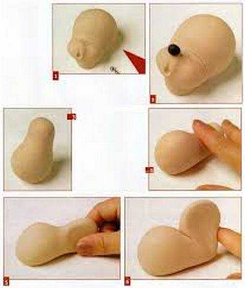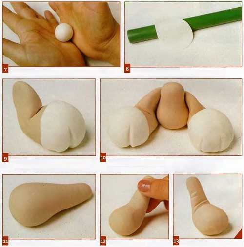 Теперь таким же образом выделяем лапки и складки, следуя эскизам. Складки живота должны быть более глубокими. Благодаря этому вы сможете придать объем животику, распределяя равномерно тесто снизу вверх, имитируя «пузико».