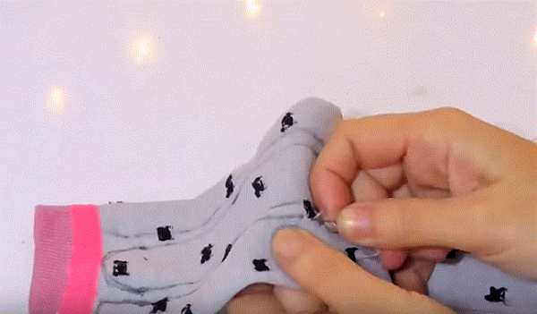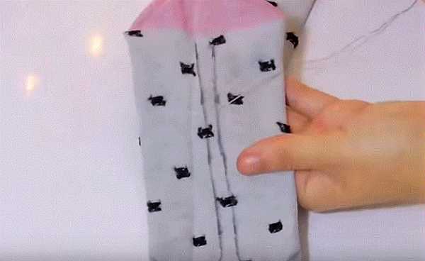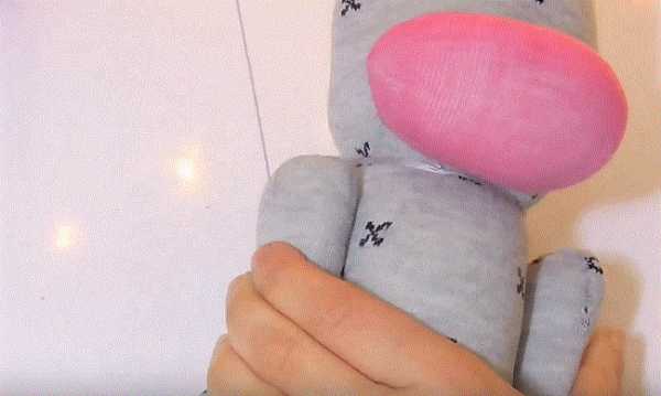 9. Вывернем через это отверстие верхнюю часть носка и нижние задние лапки. У вас должно получиться лицевая сторона носка, как на фото.