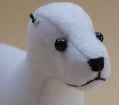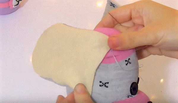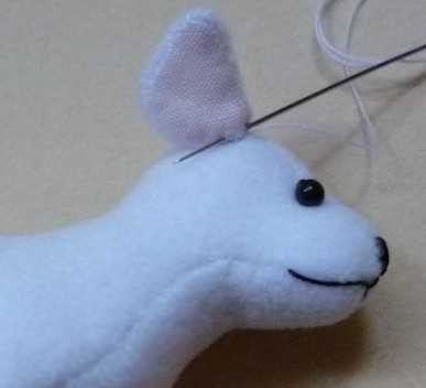 56. Осторожно пришиваем ухо с краю к голове, как на фото, для постоянной фиксации.