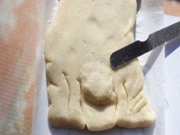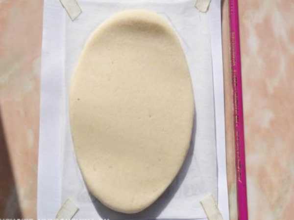 На кальке раскатайте тесно толщиной 6-7 мм. Лепешка должна полностью закрывать рисунок, с небольшим запасом.