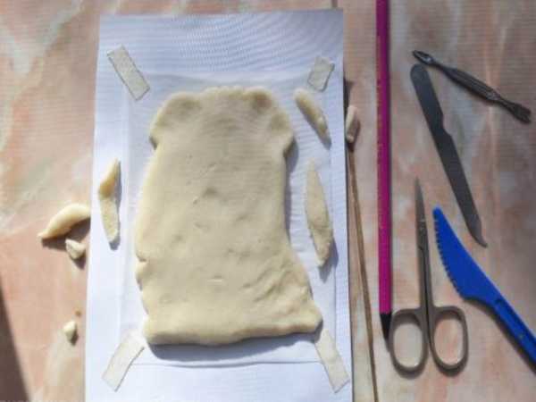 При помощи ножа для пластилина и зубочистки приступайте к вырезанию контура. Для этого вы можете аккуратно отодвигать кальку. Как только вы закончите, уберите бумагу и сравните рисунок с формой теста.