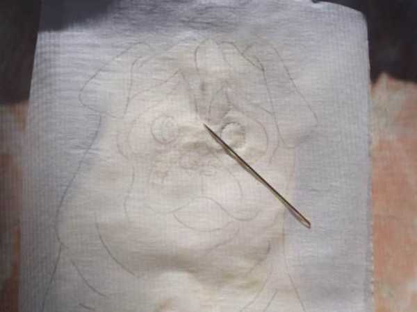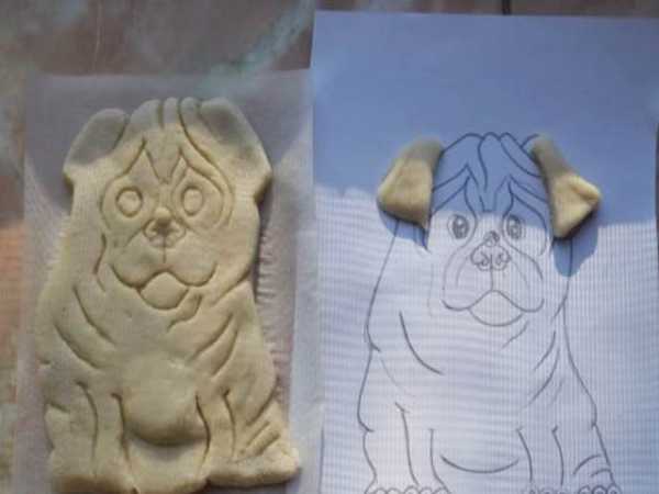 Переведите на кальку эскиз собаки. И, приложив рисунок в форме из теста, иголкой прорисуйте мордочку.