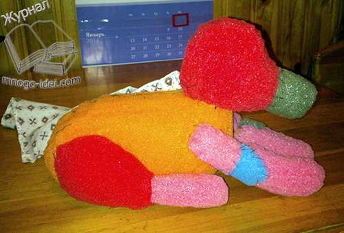 Берём кусочки поролона и делаем из них тело нашей собачки. Можно сделать его из ненужных кусочков и остатков поролона, склеиваем их между собой или сшиваем. Состригаем всё лишнее, округляем голову, мордочку и т.д. У вас должно получится примерно как на фотографии.